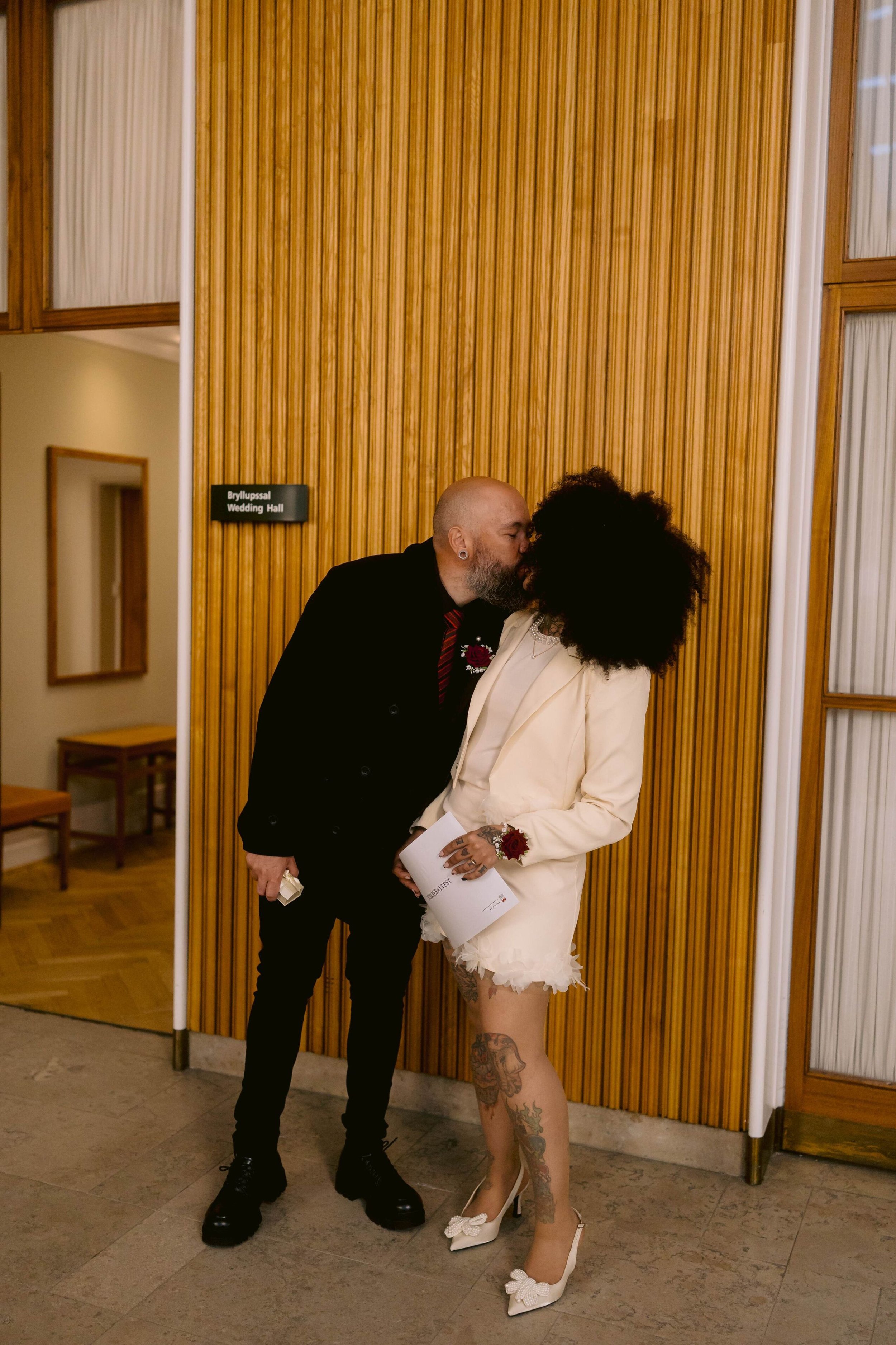 After the ceremony we headed to Haveselskabets Have for outdoor portraits. May is a wonderful time of year for a wedding in Frederiksberg Town Hall. The gardens were fresh and green, and even with cloud cover the light was soft and easy to work with. The couple had brought heart-shaped sunglasses along, which suited them perfectly. And a fun detail: Val and Cleyton have over 100 tattoos between them, which looked absolutely great in the portraits.